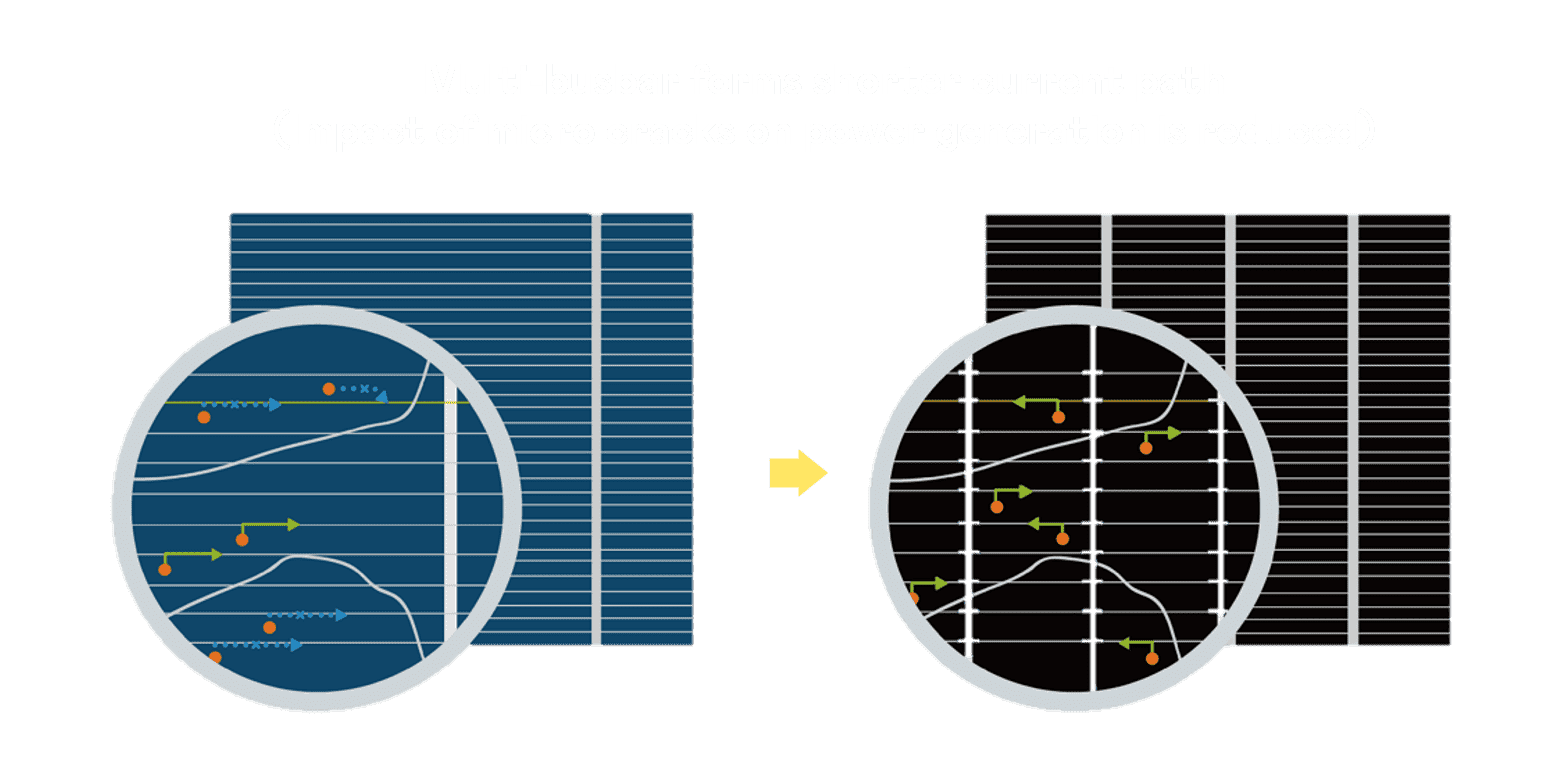 • 电池使用多条铜导线 (Copper wire) 于电池片上形成较短的电流路径,,,提高电流收集效率,,采用圆形设计的铜导线较传统扁平式的铜焊带 (Ribbon),,,,可增加入射至电池的光线量。。