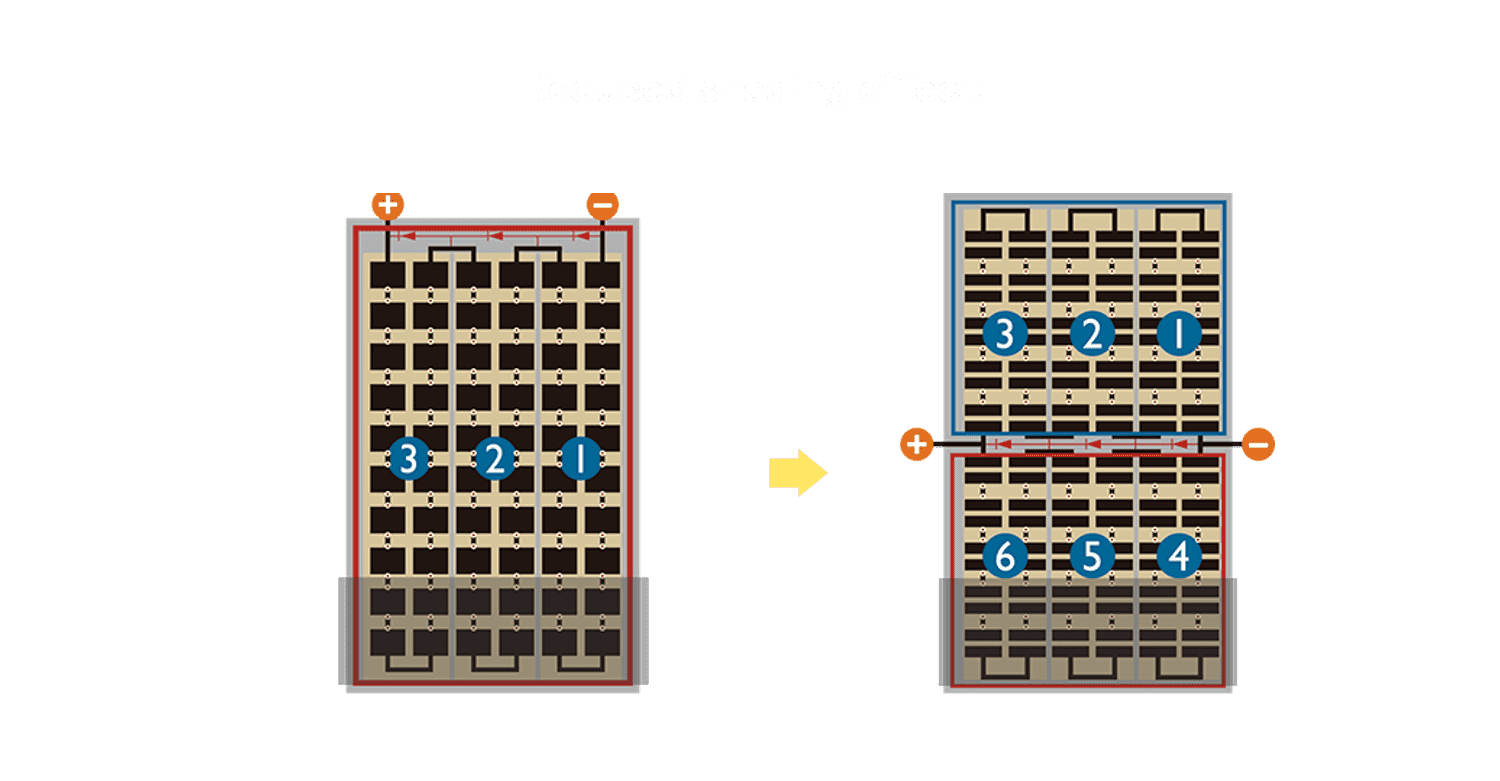 • 结合半切电池,,,降低遮阴影响、、、提升模组抗隐裂能力、、并减少电阻损耗,,,,进一步提升模组发电效能。。