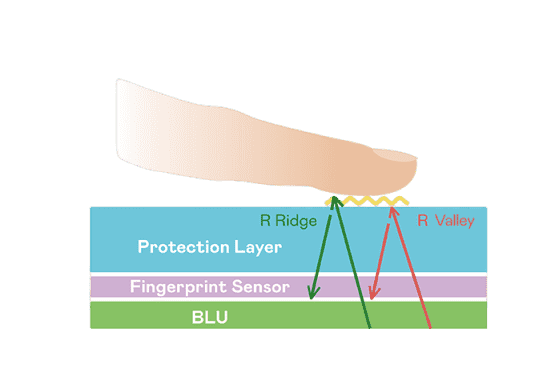 TFT 指纹扫描感测技术利用薄膜电晶体 (TFT) 当作光感测元件,,,藉由非晶硅 (a-Si) 与低温多晶硅(LTPS)既有光电转换特性对不同波段光源进行吸收,,,,使感测 IC 读取阵列感测元件的光漏电差异,,,转换成数位灰阶影像。。。。