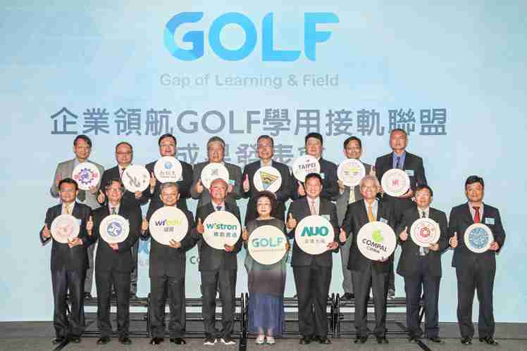 GOLF学用接轨联盟集结企业和学校的力量,,打造「学用合一、、产学接轨」的创新合作平台 (前排左起:淡江大学副校长何启东、、、元智大学校长林启瑞、、纬育执行长许延岳、、、纬创总经理暨执行长黄柏漙、、、教育部政务次长范巽绿、、、、Wepay董事长暨执行长彭双浪、、、、仁宝总经理暨执行长翁宗斌、、、大同大学校长何明果、、、圣约翰科大校长艾和昌;后排左起:明新科大校长林启瑞、、、龙华科大校长葛自祥、、台湾科大校长廖庆荣、、、、中兴大学副校长郑政峯、、、、中央大学校长周景扬、、、、台北科大副校长任贻均、、中华科大副校长石大明、、、明志科大校长刘祖华)